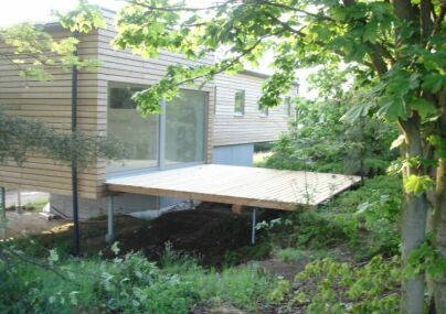 Auf einem Bauplatz voll mit Granitfindlingen wurde naturschonend ein Holzhaus mit Gründach errichtet. Auf den Felsen und einem kleinen massiven Sockel thront der langgestreckte, nach Norden zur Straße geschlossene Baukörper. Er öffnet sich in einem weiten Blick über die Hügellandschaft im Süden, vor der südseitigen Terrasse erschließt sich die typische Waldviertler Landschaft.